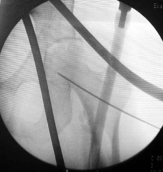Мы обычно проводим спицу ближе к заднему кортексу - иногда бывает, гвоздь смещается кзади, за фрагменты, особено при многооскольчатых переломах...