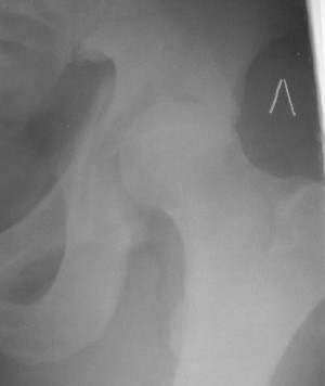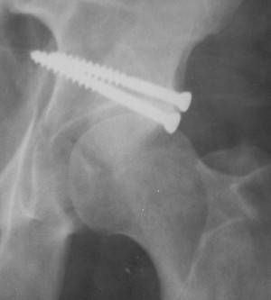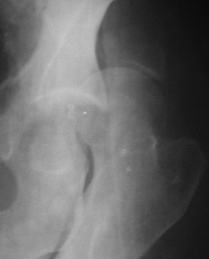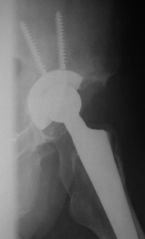 То есть в представленном Вами случае был перелом заднего типа, в нашем случае центрального. У Вашего больного был застарелый задний вывих, у нашего - перелом шейки. Столь раннее разрушение головки, вероятно, было во многом обусловлено тем, что не была достигнута анатомическая репозиция, головка бедра осталась смещенной кзади, что является частой ошибкой при крупных фрагментах свода.