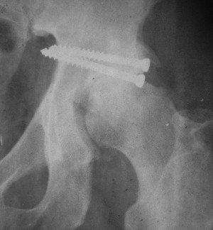 Больной 18 мая 2003 года в автоаварии получил перелом левой вертлужной впадины, вывих бедра. Госпитализирован в один из стационаров области.Вывих вправлен. В последствии бедро вывихивалось еще дважды. На консультацию был представлен снимок от 19.05.03г., больной переведен к нам 3.06.03г. Снимок при поступлении - перелом впадины, задне-верхний вывих бедра. 05.06.2003 г. выполнено открытое вправление вывиха левого бедра и остеосинтез стенки вертлужной впадины двумя винтами. Послеоперационный период без осложнений. Объем движений в левом тазобедренном суставе восстановился полностью. Выписан на амбулаторное лечение в удовлетворительном состоянии с рекомендациями 3 месяца ходить на костылях без нагрузки на оперированную конечность. На контрольных рентгенограммах левого тазобедренного сустава 13.10.2003 г. - признаки консолидации перелома; плотность, форма головки и состояние суставных поверхностей удовлетворительные. Разрешена дозированная осевая нагрузка, на конечность с использованием дополнительной опоры. 19.12.2003 г. больной обратился с жалобами на боли в левом тазобедренном суставе. На рентгенограммах левого тазобедренного сустава 19.12.2003 г., 20.02.04г. - асептичекий некроз головки бедра. 5.04.04г. - эндопротез. Сейчас ходит без трости, не хромает. Особенность эндопротезирования - при удалении винтов прослежена линия перелома заднего края впадины и предложено установить чашку несколько меньшего диаметра, чтобы она была покрыта несломанной частью.