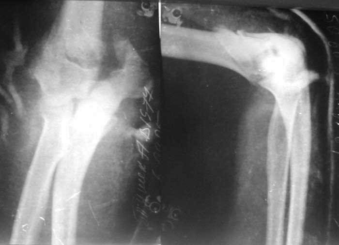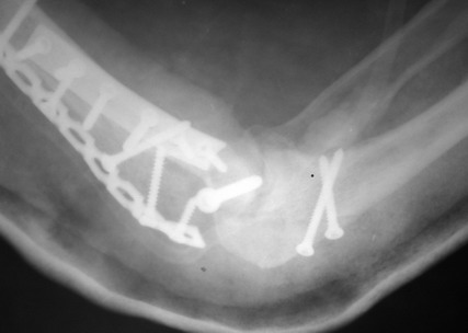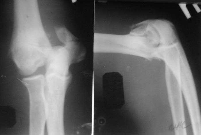 Солидарен с мнением обоих Александров (Челнокова и Рыкова): точную репозицию такого перелома вряд ли удастся выполнить закрыто. Даже во время открытого вмешательства это сделать непросто. Неслучайно предложен костно-пластический доступ с временным отсечением локтевого отростка. И по методу фиксации согласен с Александром Челноковым: 2 пластины. В качестве примера привожу рентгенограммы одного из наших пациентов с аналогичным повреждением.