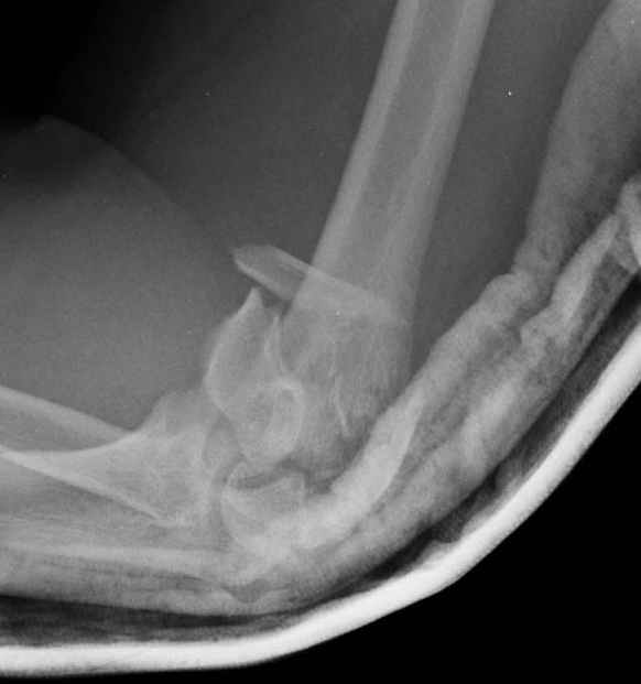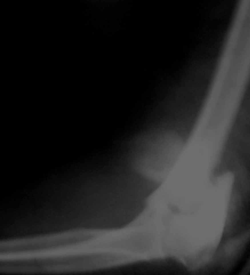 На шестой день сделали открытую репозицию чрезлоктевым доступом двумя locking plate, локтевой нерв был ушибленным, после операции положительная динамика в Flexor Carpi Ulnaris. Фиксацию локтевого отростка произвели tension band technique с дополнительным шурупом.