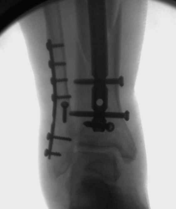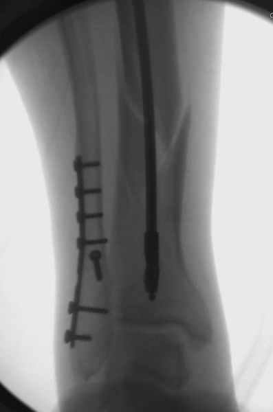 Здесь мы использовали новый Synthes Nail с дополнительными дырками, в проксимальной части 4: по две косых и поперечные (один стандартный а другой динамический), в дистальной части две поперечные, прямая и косая. Вес больного более 120 кг, нагрузку начнем через месяц.