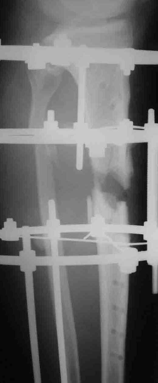 На операции после удаления пластины вывалился промежуточный свободный фрагмент,оставлять его посчитали нецелесообразным. После его удаления вскрыли костномозговой канал, зашили рану и наложили аппарат. После заживления раны концы отломков сблизили. Возможно, всё это же можно было бы сделать одномоментно и на стержне. Но как то мы не решились забить гвоздь при наличии большой раны и костного дефекта. Сейчас 2 недели после операции, больной ходит при помощи костылей с одинаковой нагрузкой на обе ноги. Укорочение в итоге 1,5 см. Обязуюсь показать снимки через пару месяцев.
