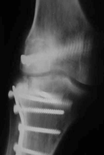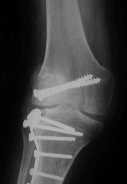 Сканирование с Тс99 поможет верифицировать наличие некроза мыщелка бедра, если использовались титановые винты, то магнитно-резонансное исследование будет более информативным. При подтверждении некроза, бедренная или всокая тибиальная остеотомии, очевидно, будут малоуспешны, поэтому альтернатив артропластике похоже не останется. Наблюдений реваскуляризации мыщелка бедра после туннелизации у меня нет, надо покопаться в литературе.
