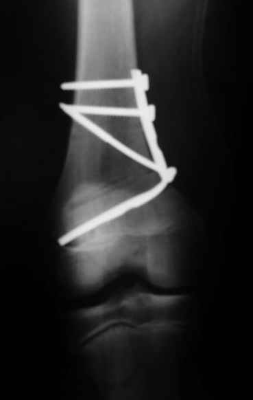 Может стоит сначала добиться сращения наружного мыщелка бедра( костная пластика) и коррекции оси?