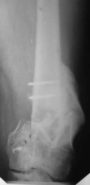 Впрочем, все равно придется через небольшой разрез убирать обломки винтов, лучше воспользоваться специальными инструментами (если нет - корончатая фреза + втулка с резьбой и стопором, спросить в "Деосте"). Востановить аппаратом недели за 2 длину и ось. И вторым этапом перейти на интрамедуллярный остеосинтез. Причем можно и анте-, а не ретроградный. Если в аппарате все уже стоит ровно - это обычно довольно гладкая и предсказуемая процедура. Ну и тут же перейти на эндопротез. Если что-то не так, протез можно и позже, когда полностью восстановится опороспособность левой ноги.