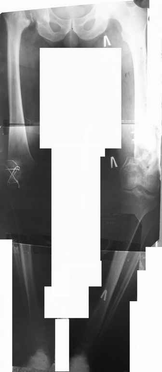 Уважаемые коллеги, прошу высказать ваши мнения по представленному случаю. Пациент - мужчина около 50лет после перенесенной год назад тяжёлой сочетанной травмы. Был оперирован, среди прочего - остеосинтез DHS-фиксатором чреcшеечного перелома правого бедра, DCS-фиксатором остеосинтез оскольчатого чрезмыщелкового перелома левого бедра. Однако, в связи с развитием гнойного коксита были вынуждены убрать DHS-фиксатор и головку. Гнойный свищ правого тазобедренного сустава закрылся сразу после операции. Из-за вторичного смещения и поломки винтов пришлось удалить DCS-фиксатор и сращивать левое бедро внешней иммобилизацией. Прошло чуть более года. Пациент ходит с опорой на обе ноги,пользуется палочкой. Справа относительное укорочение 3см. Слева варус 33гр., тугой ложный сустав н/3бедра. Движения в коленных суставах почти в полном объёме.Перед нами встали вопросы, с чего начать? Протезирование правого ТБС? Восстановление опорности левой конечности? Воспользоваться-ли для этого интрамдулярным остеосинтезом гвоздём с блокированием с ретроградным введением? Стараться при этом восстановить полностью длину, или оставить на потом, на аппаратное решение? Или сразу попытаться использовать аппарат Илизарова? Но боимся потерять колено? Вопросов много.С благодарностью выслушаем все мнения.Заранее спасибоРахматуллин Ринат НургаяновичГКБ N 13 г.Уфа.