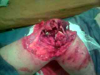 Обработка раны и spanning аппарат. То есть по секции на плече и предплечье, сгибание в локте 90 градусов. Потом повторные обработки. По заживлении ран - переоценить ситуацию "с чистого листа".