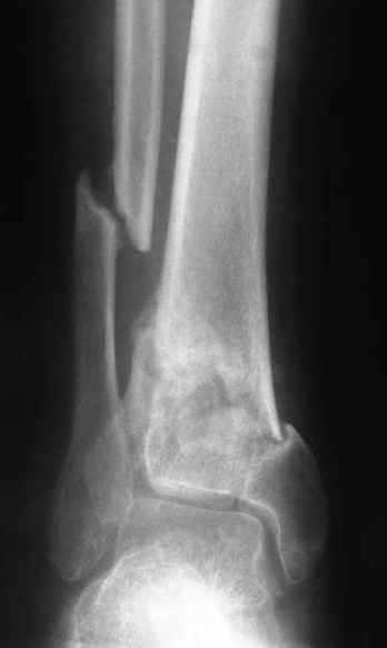 из A 56 year old laborer fell off a wall approximately 5 months ago. He sustained an open pilon fracture. He was treated with debridement and external fixation. After he was treated for 4 months, the external fixator was removed.