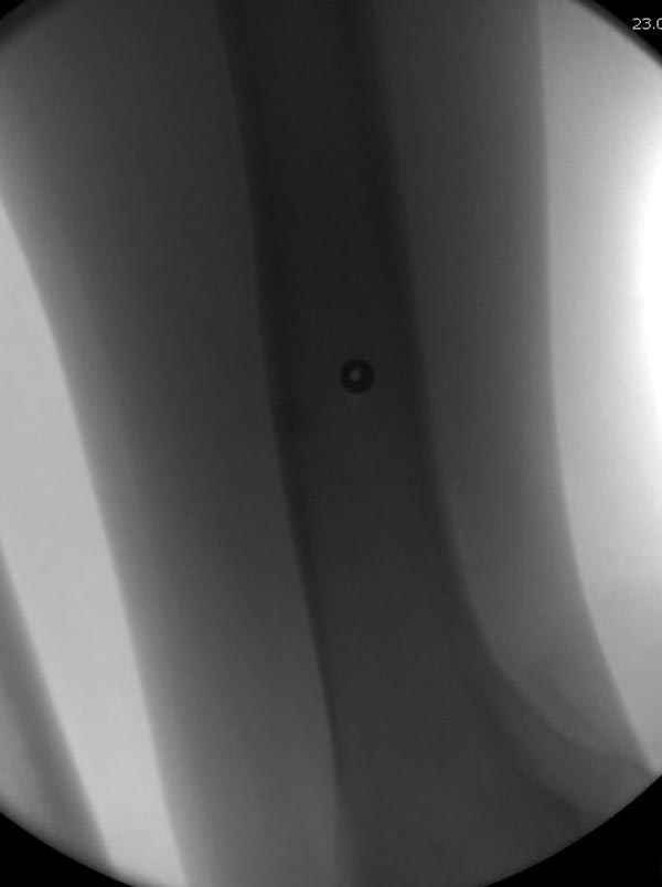 Методика штифтования при отсутствии большой зоны перелома как при онкологических профилактических штифтованиях, расверливание интрамедуллярного канала проводим с предварительным наложением дополнительного дренажного отверстия в дистальном отделе бедра (в данном случаи в канале оставили 6.5 мм канюлированный шуруп), иначе при создании давления в канале во время сверления имеется опасность эмболизации легочной артерии тромбом.