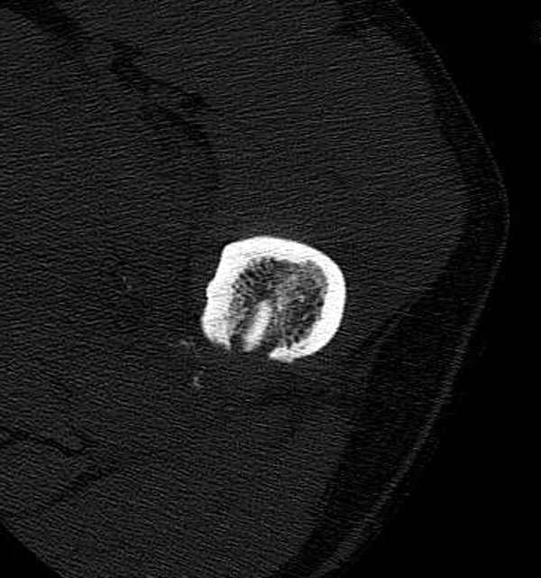 из Уважаемые коллеги. Больной с огнестрельным переломом бедра с вовлечением около 15% медиального кортекса, входное отверстие около 1 см в диаметре; стабильный, без сосудистых и неврологических признаков.