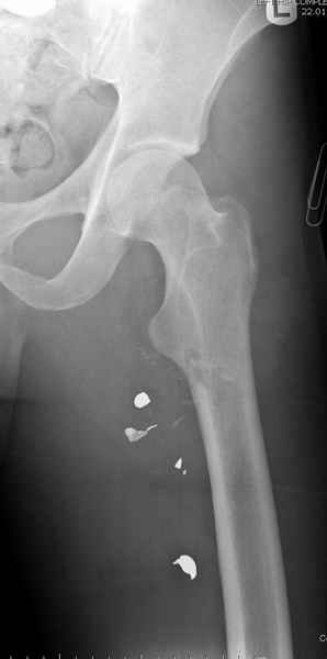 Методика штифтования при отсутствии большой зоны перелома как при онкологических профилактических штифтованиях, расверливание интрамедуллярного канала проводим с предварительным наложением дополнительного дренажного отверстия в дистальном отделе бедра (в данном случаи в канале оставили 6.5 мм канюлированный шуруп), иначе при создании давления в канале во время сверления имеется опасность эмболизации легочной артерии тромбом.