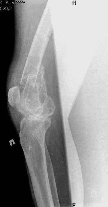 Коллеги!Окажите, пожалуйста, консультативную помощь.Мужчина, 41 год, 15 лет состоит на учете по поводу ревматоидного полиартрита, гормонзависимый (преднизолон получает нерегулярно). В процесс вовлечены крупные и мелкие суставы. 01.01.06 - без травмы наступил патологический перелом на границе н/3-с/3 бедра (перелом на фоне кистозных изменений?) Биопсия из зоны перелома - <реактивные изменения в очаге перелома>, без признаков опухоли. На рентгенограммах, помимо перелома, кистозные изменения на мыщелках б/берцовой кости и мыщелке бедра с другой стороны. До травмы со стороный коленных суставов был болевой синдром, функция практически в полном объеме. Какие будут предложения по тактика лечения перелома и кист на противоположом бедре? Заранее благодарю! С уважением, А.В.Владзимирский Донецкий НИИ травматологии и ортопедии Донецк, Украина