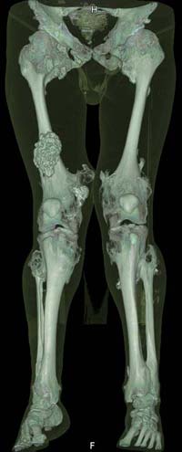 Больной настоятельно просит об исправлении деформаций и удаления экзостозов области коленных суставов. Планирую поэтапно, сначала справа, произвести вальгизирующе-антекурвационную остеотомию в подвертельной области бедра, соответственно варизирующую на голени, фиксация фрагментов спице - стержневым аппаратом Илизарова. Одновременно удалить большой экзостоз в области конен. сустава Представляя всю сложность понимаю что тут не 7 а 17 раз надо отмерить, потому хотелось бы узнать ваше мнение: Смогут спицы и стержни адекватно фиксировать такую кость? Какие сроки сращения можно ждать? Есть ли угроза малигнизации, в частности после удаления экзостозов? И, наконец вообще, браться за это или нет? Все соображения будут приняты с благодарностью. Аршак Мирзоян Мед объединение Наири, Ереванский Центр Реконструкции и Удлинения Конечностей Dear all, 30 years old male with chondrodysplasia and multiple exostoses admitted. Multilevel deformities, flexion-adduction limitation of hip ROM, lumbar lordosis. Intellectually developed, working in some software company. Painless. Blood tests are normal, except low Calcium (total serum Ca 1. 62, N is 2.3 - 2.75; ionized 0.67 N is 0.7 -1.07) and low alkaline phosphatase 7.9. Diaphysis bone density is about 150 - 200 NU (N in his age is 300 - 350NU). Metaphis osteoporosis is from 100NU to minus 80 NU. Patient has strong motivation to treatment. He wants to deformities be corrected and few exostoses in knee areas be removed. I am thinking about subtrochanteric valgization osteotomy of femur, varization osteotomy of tibia, fixation with Ilizarov - hybrid type external fixator, simultaneously removal of big exostosis in right knee area. But, before do something, I would like to know your valuable opinions. My questions are: Can external fixator (wires, half pins) hold such a bone strong enough? How this bone will heal? Is it a danger of malignancy after exostosis removal? And after all, considering all this, to do or nor to do? (to be or not to be?) Additional exam? Thanks in advance, Arshak Mirzoyan Nairy Medical Union; Yerevan Center of Limb Lengthening and Reconstruction.