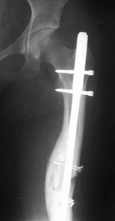 В июне 2003 года миграция стержней - стержни убраны. Повторный перелом в декабре 2003 года. Произведён МОС стержнем. Сегодня повторный перелом на стержне. Конечность уложена на шину Беллера. Господа, как можно удалить данный стержень? Чем предпочтительнее, на Ваш взгляд, синтезировать данный перелом у молодого растущего юноши с ожирением П ст.: пластиной, простым стержнем или стержнем с блокированием? ЭОПа у нас нет, поэтому пользуемся наборами ДЕОСТа с дистальной навигацией.