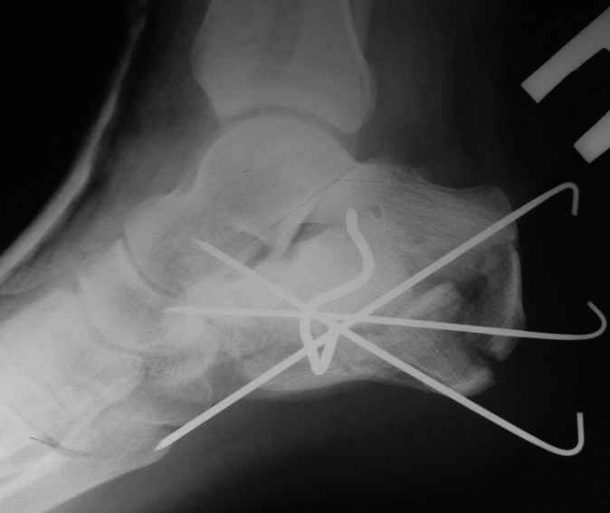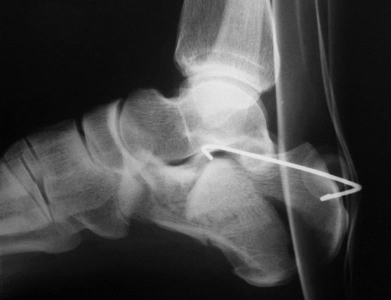 представляю снимки пациента с переломом пяточной кости. послеоперационный снимок этапный - по снятии швов спицы удаляю и наладываю циркулярную гипсовую повязку. к сожалению снимки с удаленной скобой представить не могу но поверьте на слово - консолидация полная, коррекция стойкая.