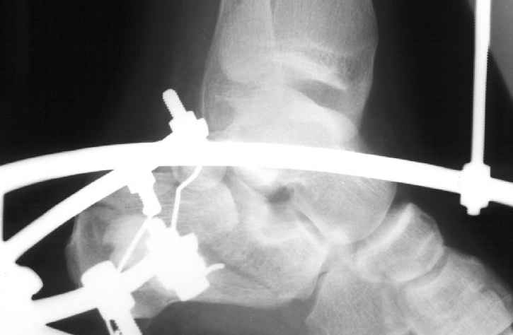 Учитывая сроки после травмы, я бы 1 этапом наложил дистакционный аппарат(будут трудности при одновременном восстановлении длины пятки, кроме того не надо забывать о возможных краевых некрозах). Удачи.