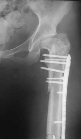 Уважаемые коллеги, приношу извенения за молчание. Готовили материал и боялись писать раньше времени. Все хотели убедиться в том, что после операции все будет спокойно. Спасибо за отклики и советы. К сожалению, гамма-гвоздя, штифтов с возможностью установки более 2-х блокирующих винтов у нас нет. Зато нашли достаточно длинную пластину с угловой стабильностью. После проведения предоперационной подготовки и планирования выполнили остеосинтез. В условиях рентгеноперационной, после репозиции дистрактором из одного разреза 5см в проксимальном отделе подкожно установили пластину. Пришлось выполнить дополнительный разрез до5см в проекции перелома диафиза в средней трети, из которого удалось репонировать перелом и выполнить фиксацию стягивающим винтом. Затем все завершилось наложением пластины с угловой стабильностью. Пластина оказалась достаточно длинной, что позволило перекрыть все переломы с фиксацией каждого отломка минимум 5-ю винтами. Синтез достаточно стабилен. Пациентка активизирована на 3-и сутки(снимки прилагаются). В настоящий момент пациентка выписана на амбулаторное лечение. Еще раз, огромное спасибо всем за помощь в выборе тактики и просто совете. С уважением Украинский Е.