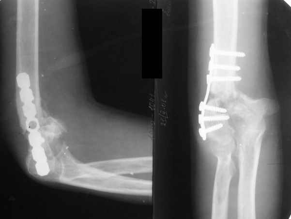 The recent x rays show established Non union with poor quality bone in the distal fragement. The joint is also appearing degenerate. In view of the multiple failed reconstructive surgeries, an Elbow replacement would seem reasonable.