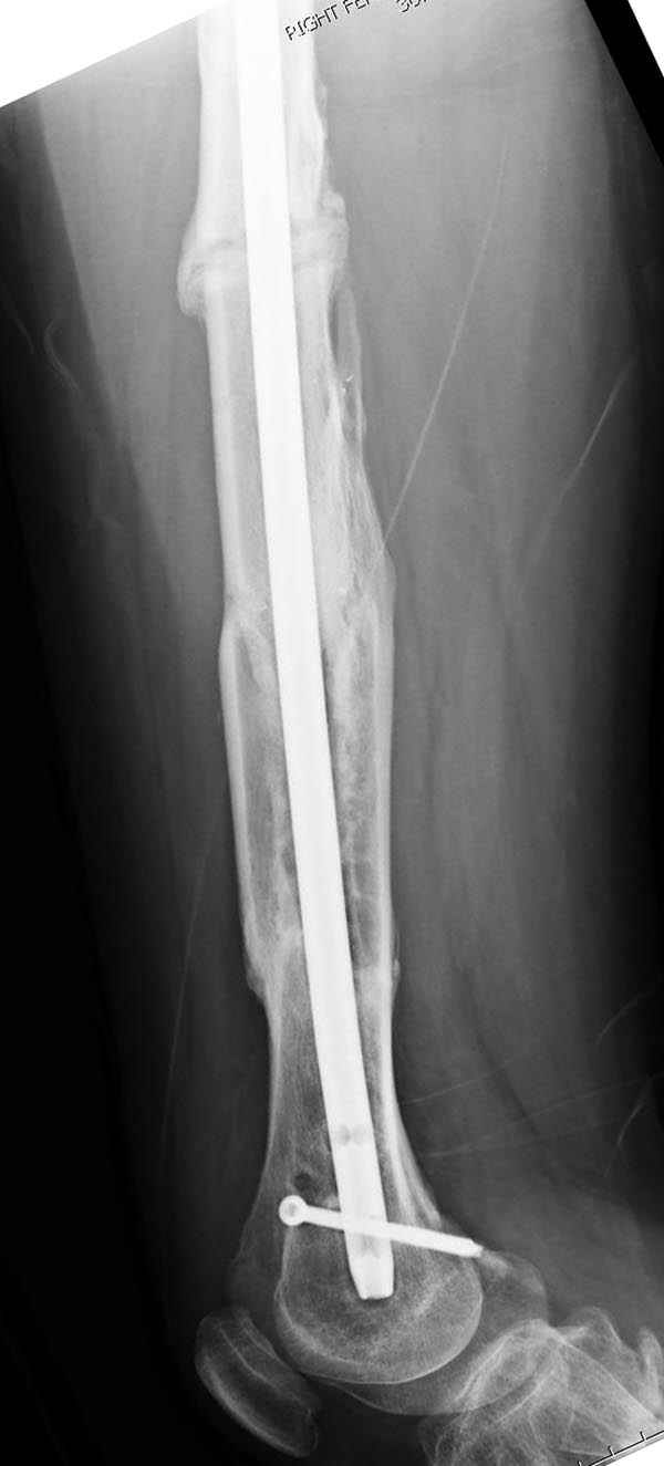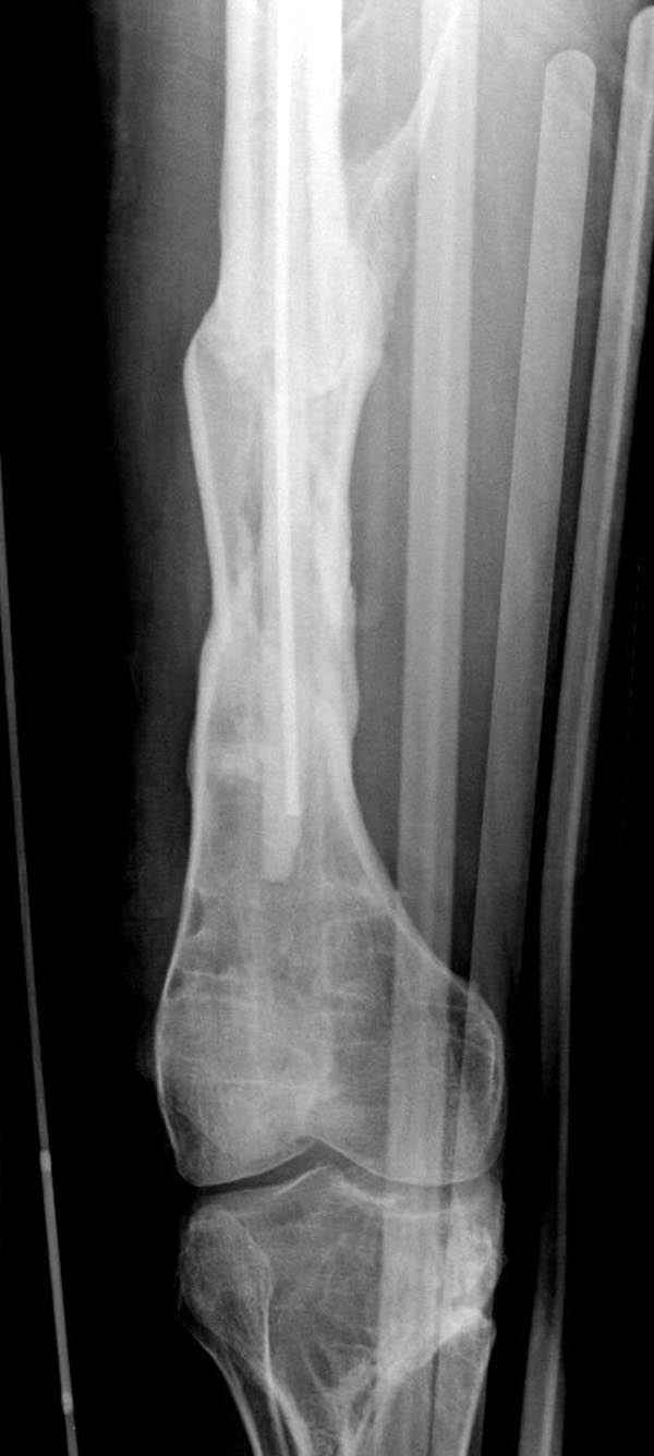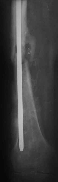 после промывки канала с рассверливанием внутреннего кортекса, через 4 недели антибиотический штифт удалили, оспалителный процесс остановлен и бедро сросся.