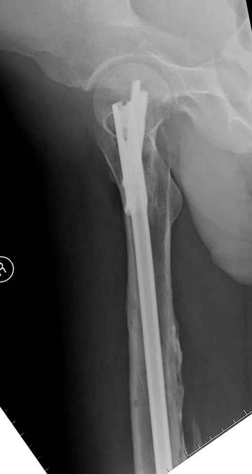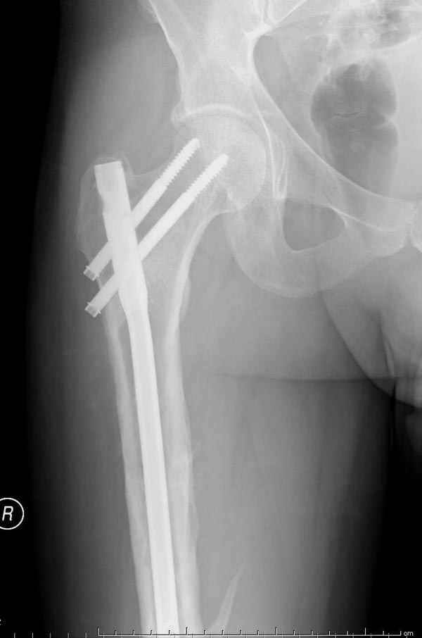 На представленных R-граммах нет снимков с АВФ. На снимке №4 дистальный статический винт не доходит до второго кортикала. Если это имелось ввиду, то хотелось бы уточнить, могло ли это привести к повторному перелому бедра, в котором интрамедуллярный штифт отсутствовал.