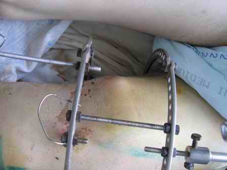 Зачем проводили спицу в проекции артерии? Уж если нет возможности ввести стержни, то хотя бы спицы выше середины бедра лучше вводить прямо впереди назад, тогда сосуды и седалищный нерв останоутся кнутри.