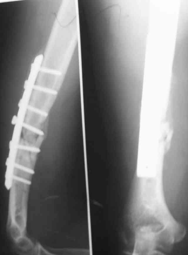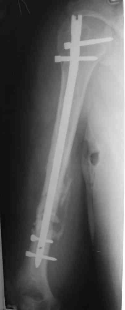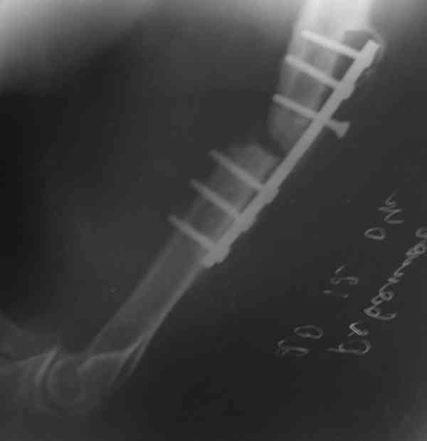 Штифт - отвисание проксимального отдела - накостный остеосинтез, нагноение, АФВ с ревизиями раны, опять пластина и снова нестабильность. Была удалена пластина и выполнен БИОС штифтом ChM (ДЕОСТ). Через 2 нед. пациент сел за руль и вышел на работу. Причем так и работает до сих пор уже 1,5 года, хотя полного сращения мы вроде бы не достигли ( снимки пришлю позже) - пациент не приходил на осмотры, общался только по телефону.