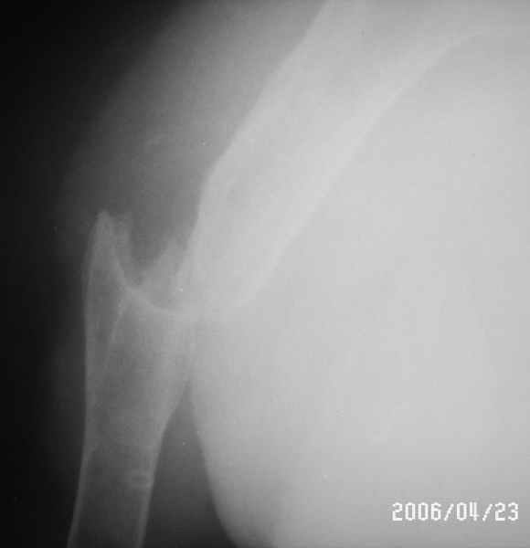 Уважаемые коллеги! Помогите в выборе тактики лечения больной Р.,56 лет, с болтающимся ложным суставом с/3 правой плечевой кости 2-х летней давности. В анамнезе - бронхиальная астма, гормонозависимая форма, ожирение III cт. Травма - автодорожная, получила закрытый многооскольчатый перелом диафиза плечевой кости со смещением (от метафиза до метафиза), в экстренном порядке нами произведен закрытый остеосинтез стержневым аппаратом, отломки удалось сопоставить анатомически. В дальнейшем больная выпала из поля зрения. Как потом выяснилось, после снятия стержневого аппарата, больная долечивалась по Илизарову специалистом из г. Кургана. Аппарат Илизарова удален из-за нагноения мягких тканей. Последние два года работая бухгалтером, фиксирует плечо ортезом. Теперь вновь обратилась к нам для ликвидации ложного сустава.