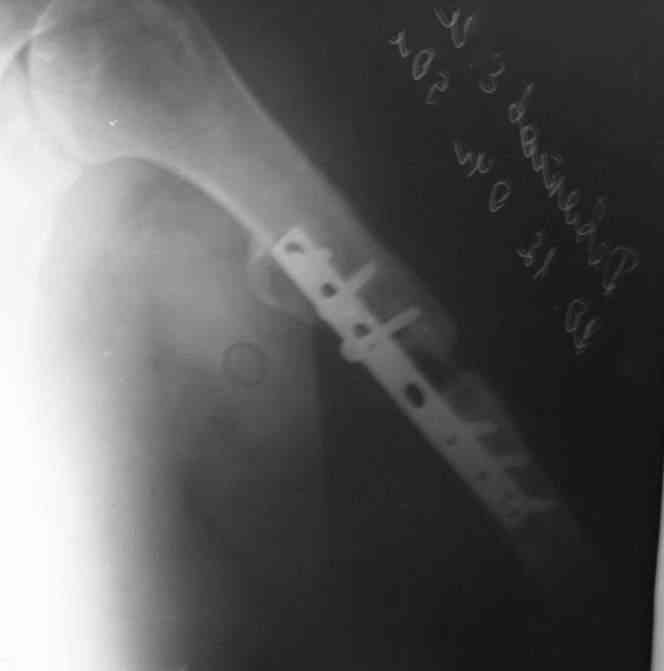 Уважаемые коллеги! Большое спасибо за советы, да еще и с иллюстрациями. Наша частная клиника ортопедотравматологического профиля имеет все необходимое для накостного остеосинтеза, но современный интрамедуллярный остеосинтез нам пока не доступен. Предполагаю: предложить больной и далее жить, пользуясь ортезом, а в случае отказа, не рисковать и отправить на лечение в другое лечебное учреждение. К нам больная претензий не имеет, лучевой нерв не поврежден. Достойно и гарантировано помочь не сможем, поскольку я склоняюсь к эндопротезированию диафиза.