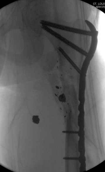 Перелом низкоскоростным оружием, типа пистолетного, так что не стали гоняться за пулевыми фрагментами. С нервом пока подождем, иногда нерв восстанавливается если не прямое попадание в нерв, а "сотрясение" (shock wave injury).