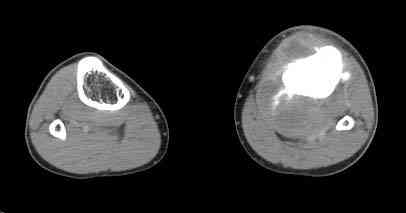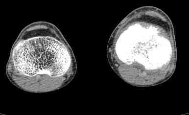 При обращении к нам произведена сцинтиграфия скелета - зоны гиперфиксации РФП: верхняя треть голени- 960%, нижняя треть бедра - 380%, Дистальный метафиз голени и затылочная область - 140%. В легких - метастазов нет. Произведена КТ (картинки в приложении). Учитывая абсолютную нестыковку рентгенологических и морфологических данных повторно биопсия. Выявлено, что первичная биопсия выполнялась из поверхностной параоссальной зоны - там локализованы хрящеподобные массы, далее очень плотная кость без хрящевых участков - биоптат взят фрезой с большим трудом. Морфологического заключения пока нет. Хотелось бы узнать Ваши варианты диагноза и соответственно тактику.