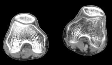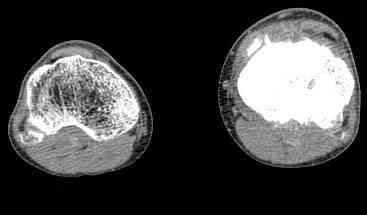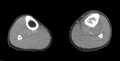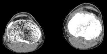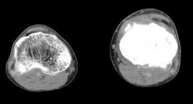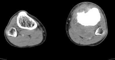 важаемые коллеги! Поступил больной 22 лет. Болен с января 2006 - появились боли в области верхнейтрети голени. При первичном осмотре в поликлинике был заподозрен первично-хронический остеомиелит - осмотрен гнойным хирургом - произведена биосия . Заключение - хондросаркома. Осмотрен онкологом - с учетом характера опухоли - химиотерапия, лучевое лечение не показано. Предложена либо ампутация, либо решение вопроса о возможности выполнения органосохраняющей операции. При обращении к нам произведена сцинтиграфия скелета - зоны гиперфиксации РФП: верхняя треть голени- 960%, нижняя треть бедра - 380%, Дистальный метафиз голени и затылочная область - 140%. В легких - метастазов нет. Произведена КТ (картинки в приложении). Учитывая абсолютную нестыковку рентгенологических и морфологических данных повторно биопсия. Выявлено, что первичная биопсия выполнялась из поверхностной параоссальной зоны - там локализованы хрящеподобные массы, далее очень плотная кость без хрящевых участков - биоптат взят фрезой с большим трудом. Морфологического заключения пока нет. Хотелось бы узнать Ваши варианты диагноза и соответственно тактику.