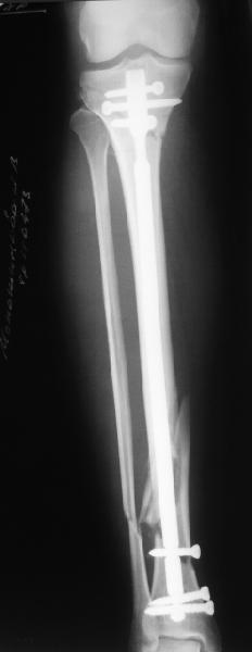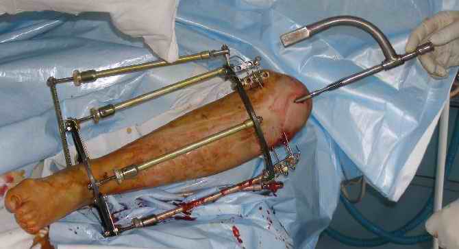 На одной опоре, расположенной чуть дистальнее обычного, были закреплены 4 спицы, проведенные во фронтальной плоскости, по 2 в передней и задней части смежных фрагментов. Закреплены так, чтобы при их натяжении создалась компрессия. Картинка в приложении.