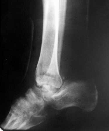 В качестве варианта хирургического лечения мы считаем возможным выполнить следующее вмешательство: артродез большеберцовой и пяточной костей в сочетании с артродезом переднего края большеберцовой кости и головки таранной кости с фиксацией спонгиозными винтами. Считаем выполнение артродеза переднего края большеберцовой кости и элементов I луча стопы необходимым для максимального восстановления опороспособности конечности. Однако выполнение операции в указанном объеме привело бы к относительному укорочению внутреннего свода стопы. Мы видим два пути решения данной проблемы: