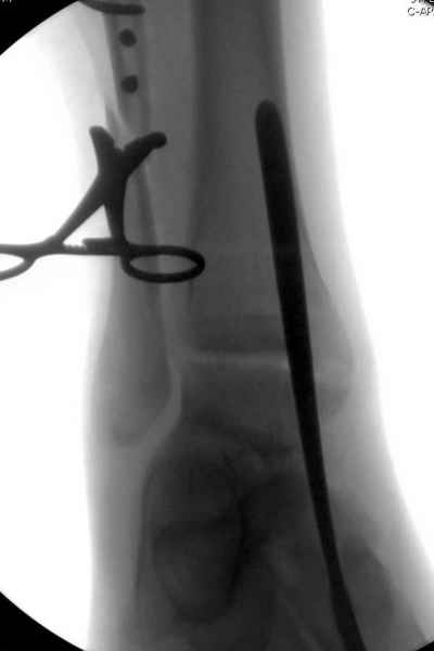 Здесь похожий случай трехнедельной давности, перелом почти сросся и была укорочена малоберцовая, на операции длину малоберцовой смогли восстановить только после того, когда проксимальнее пластины ввели шуруп и использовали его как толкатель, с помощбю дистракционого инструмента (lamina spreader).