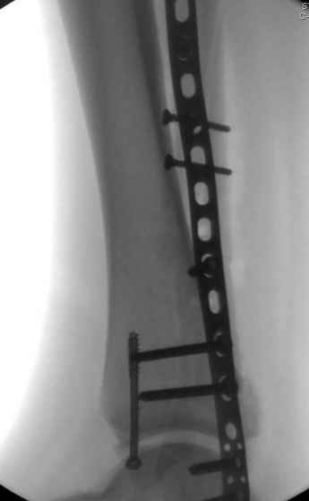 С мнением «провести позиционный межберцовый винт чуть ниже пластинки в положениий тыльного сгибания стопы» согласен, но я бы нагрузку начал через три недели и удаление шурупа можно провести через 6-8 недель.