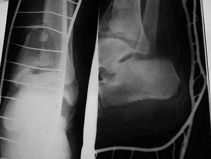 из Здравствуйте, коллеги. Больной 26 лет, в 2004 году попал ко мне с диагнозом: синтезированный в аппарате Илизарова неполный внутрисуставной оскольчатый перелом дистального метафиза левой большеберцовой кости со смещением; выраженный остеопороз; множественное спицевое нагноение. Несостоятельность фиксации (костные отломки буквально "елозили" по спицам, несмотря на наличие упорных площадок).