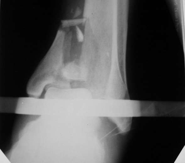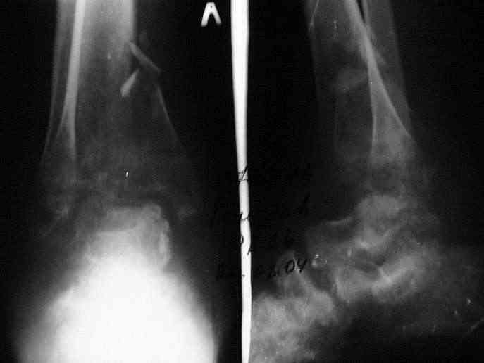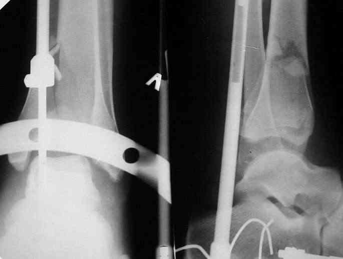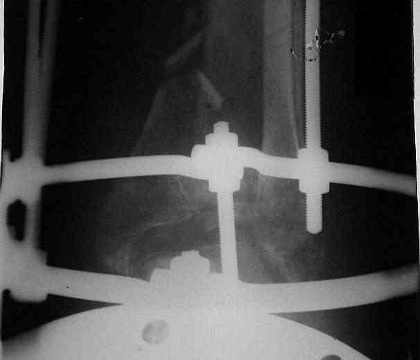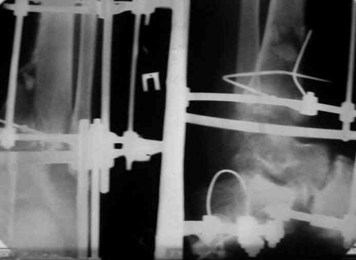 Здравствуйте, коллеги.Больной 26 лет, в 2004 году попал ко мне с диагнозом:синтезированный в аппарате Илизарова неполный внутрисуставной оскольчатый перелом дистального метафиза левой большеберцовой кости со смещением; выраженный остеопороз; множественное спицевое нагноение. Несостоятельность фиксации (костные отломки буквально "елозили" по спицам, несмотря наналичие упорных площадок). Было решено, уже по ходу операции, выполнить артродез болтом-стяжкой, тем самым компрессируя резецированные суставные поверхности и смещая стопу латерально, дабы нивелировать варусную деформацию и восстанавливая тем самым опорную ось всей конечности. Послеоперационный период без особенностей. Вчера (прошло около 8 месяцев)больной обратился ко мне в очередной раз с жалобами на боли умеренно-жгучего характера в области выстояния концов болта-стяжки. На момент осмотра:укорочение левой нижней конечности на 1,5 см; гипотрофия медиальной группы мышц голени и четырехглавой мышцы бедра; передвигается без дополнительной опоры в ортопедической обуви на растояние до 5 км; работает приемщиком цветных металлов (приходится перетаскивать грузы). Нарентгенограмме, насколько это можно видеть, костного блока сформировать не удалось, но движений в голеностопном суставе нет - ни активных, ни пассивных. Послеоперационные рубцы б/о; свищей и нагноения не было. Активно больногонаблюдать не приходилось, т.к. проживает в другом городе. Стоит ли необходимость удаления болта-стяжки из-за болевого синдрома? ЗЫ: Прошу прощения за очень низкое качество представленных ренгенограмм. Буду очень признателен за комментарии. -- С уважением, Заднепровский Никита Николаевич < | >