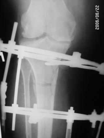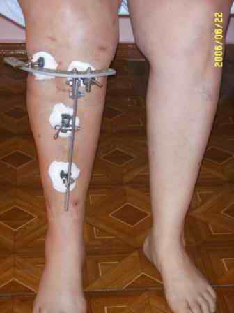 На последнем фото внешний вид больной на завершающем этапе лечения (30 сутки) с трансформацией АВФ из гибридного в стержневой. Боль уходит сразу после операции. При данной Р-картине консервативно показано применение только обезболивающих препаратов - трамадол до 3 мес. по 100-200 мг в сутки, возможно внутрисуставное введение морфина 1,0 мл. При скрыто протекающем синовиите добавляются НПВС. Кроме того, должна помочь остеорефлексотерапия - в/костной иглой пункция проксимального метафиза б/б кости с введением 1,0-0,5 мл. физ.р-ра или новокаина. Возможе и вариант расширенного вмешательства по Беку: узким долотом через кожный разрез в 3-4 мм делается «прокол» кортикального слоя и маятникообразными движениями разрушается костный мозг. Боль проходит практически всегда и надолго.