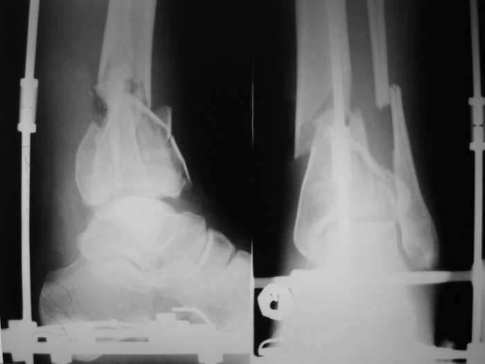 из Здравствуйте, коллеги. Пять дней назад поступил молодой человек с DS: открытый внутрисуставной многооскольчатый перелом дистального метафиза правой б/берцовой кости, надсиндесмозный поперечный перелом м/берцовой кости со смещением. Нагноение раны.