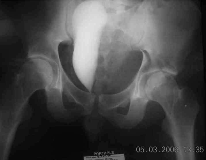 the case that I found is a 20yo male, MCC. his AP pelvis shows an interesting position of his bladder. it is pushed aside by a hematoma from SGA injury. we did a limited lateral window approach for the anterior column first, pt bumped up/supine. then closed and repositioned for KL. I could not find intra-op photos of cases when we did only a small incision for the AC screw (but they do exist!!). the lateral window is available for reduction assessment if a KL approach is being used. in the lateral position this window is available. the prone position definitely takes pressure off of the post column and facilitates reduction. in the lateral position a schantz pin in the ischial tub +/- bone hook in sciatic notch helps with PC reduction. the lateral position also gives better airway access for anesthesia. airway problems are rare, but prone position seems to be a bit more of a challenge to exchange the tube, or reintubate altogether. just something further to debate!