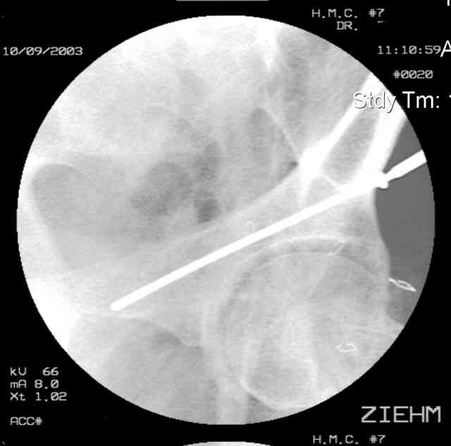 OK, now we're inserting the drill percutaneosuy using a sleeve. This fluoro shot is not for this patient (notice no clamp) but I was too lazy to go searching the PACS for one with the clamp on, so pretend...I'll save the next ones and send along...the imaging is the same and the clamp doesn't obstruct imaging other than very rarely...you can always tilt the C-arm a bit to clear it if the clamp obstructs the exact spot that you'd like to see. We'll assume that everyone knows the safe zone for a medullary ramus screw. Use a calibrated drill and sleeve of known length to simplify your life...or use Alex's fancy cannulated screws...I like 3.5mm screws because the oscillating 2.5mm drill bounces and remains intraosseus when it oscillates and contacts endosteal cortical ramus... so will the screw, and like a long bent screw IF the fracture is clamped... if unclamped, when the screw contacts the endosteum, it pushes the reduction apart instead of bouncing. The big 7mm cannulated screws fit few patients and extrude...we very rarely use them any more...you'll see an old one later.