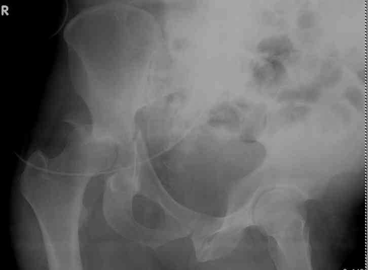 из 45 yo male in MVA, only other injury=small subarrachnoid bleed (neurologically fine, GCS never <14), with this transverse & associated posterior wall fx-dislocation 7/7