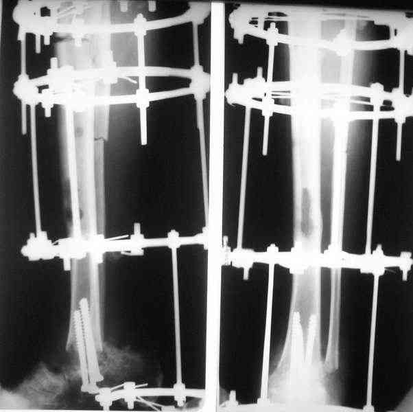 Прилагаем послеоперационные рентгенограммы. Во время операции мы удалили кортикальный слой по передней и задней поверхностям нижнего конца большеберцовой кости и при анализе рентгенограммы может сложиться ложное впечатление, что между соединяемыми костями уложен большой костный трансплантат. Но нам удалось добиться хорошей стыковки между большеберцовой и пяточной костями. На большеберцовой кости имеются следы лечения хронического «стержневого» остеомиелита (некрсеквестрэктомия за 2 месяца перед последней операцией). Александр Николаевич, Ваш пример с блокируемым штифтом подкупает своим изяществом. А мы то по наивности думали, что мы лучшие в мире. Оказывается, это не так. Да-а-а, немного обидно.(П.И.) Спасибо всем за помощь. А. Федосов, О. Диденко, П. Иванов. Отделение множественной и сочетанной травмы НИИСП им. Н.В. Склифосовского, г. Москва.