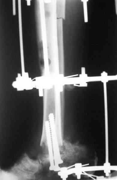 Уважаемые коллеги!Мы представляем послеоперационные рентгенограммы пациента, ситуация с которым послужила поводом для данной дискуссии. Прилагаем послеоперационные рентгенограммы. Во время операции мы удалили кортикальный слой по передней и задней поверхностям нижнего конца большеберцовой кости и при анализе рентгенограммы может сложиться ложное впечатление, что между соединяемыми костями уложен большой костный трансплантат. Но нам удалось добиться хорошей стыковки между большеберцовой и пяточной костями.На большеберцовой кости имеются следы лечения хронического «стержневого» остеомиелита (некрсеквестрэктомия за 2 месяца перед последней операцией). Александр Николаевич, Ваш пример с блокируемым штифтом подкупает своим изяществом. А мы то по наивности думали, что мы лучшие в мире. Оказывается, это не так. Да-а-а, немного обидно.(П.И.) Спасибо всем за помощь. А. Федосов, О. Диденко, П. Иванов. Отделение множественной и сочетанной травмы НИИСП им. Н.В. Склифосовского, г. Москва. < | >