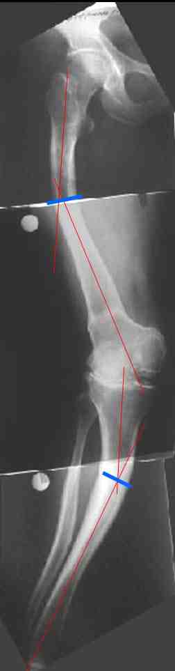 В данном случае перед эндопротезированием мы бы корригировали оси бедренной и большеберцовой костей (см. вложение). Дистальный эпидиафизарный угол бедра будет корригирован при эндопротезировании. Тип остеотомии и коррекции деформации (клиновидная резекция - одномоментная коррекция; формироване треугольных или трапециевидных регенератов во времени) - исходя из