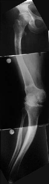 Обратилась дама 57 лет с намерением протезировать коленный сустав. Имется грубая осевая деформация (см. рентгенограммы). Встает вопрос насчет улучшения оси конечности. Даже с мобилизацией на пртяжении при таком вальгусе малоберцовому нерву может не поздоровиться. Уважаемые коллеги, как лучше провести коррекцию? Какой сегмент, на каком уровне, на какую величину? Что бы Вы исправили до протезирования, что можно оставить и сделать вместе с замещением сустава?