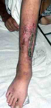 Поступила больная 68 лет с чрезвертельным переломом левого бедра. Все бы ничего, но на правой голени интересная картинка.