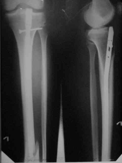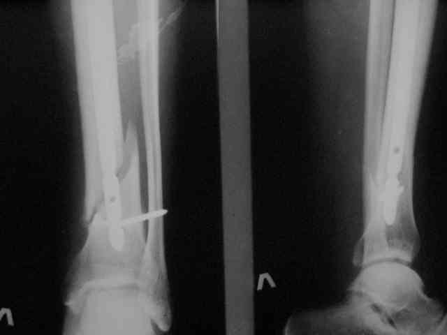 Здравствуйте коллеги!Больной 29 лет поступил 1 мая с Диагнозом: Закрытый спиральный перелом н/3 большеберцовой кости, перелом в/3 малоберцовой. На пятые сутки выполнен вот такой остеосинтез (см R-gr) . На сегодня мы имеем перелом нижнего винта, замедленное сращение( R- gr от 11.09.06) Больного ничего не беспокоит, ходит с костылями с ограниченной нагрузкой. На наш взгляд возможно обойтись :1 Удаление сломанного винта и верхнего блокирующего с последующим более глубоким погружением штифта и его дистальным блокированием. Либо замена на более длинный (Экперт-Синтез).2 Остеотомия косая малоберцовой кости.С большим вниманием выслушаем возможные варианты, тактики в таком случае.С Уважением Владимир Бахарев.P.S Извинямси за качество снимков!