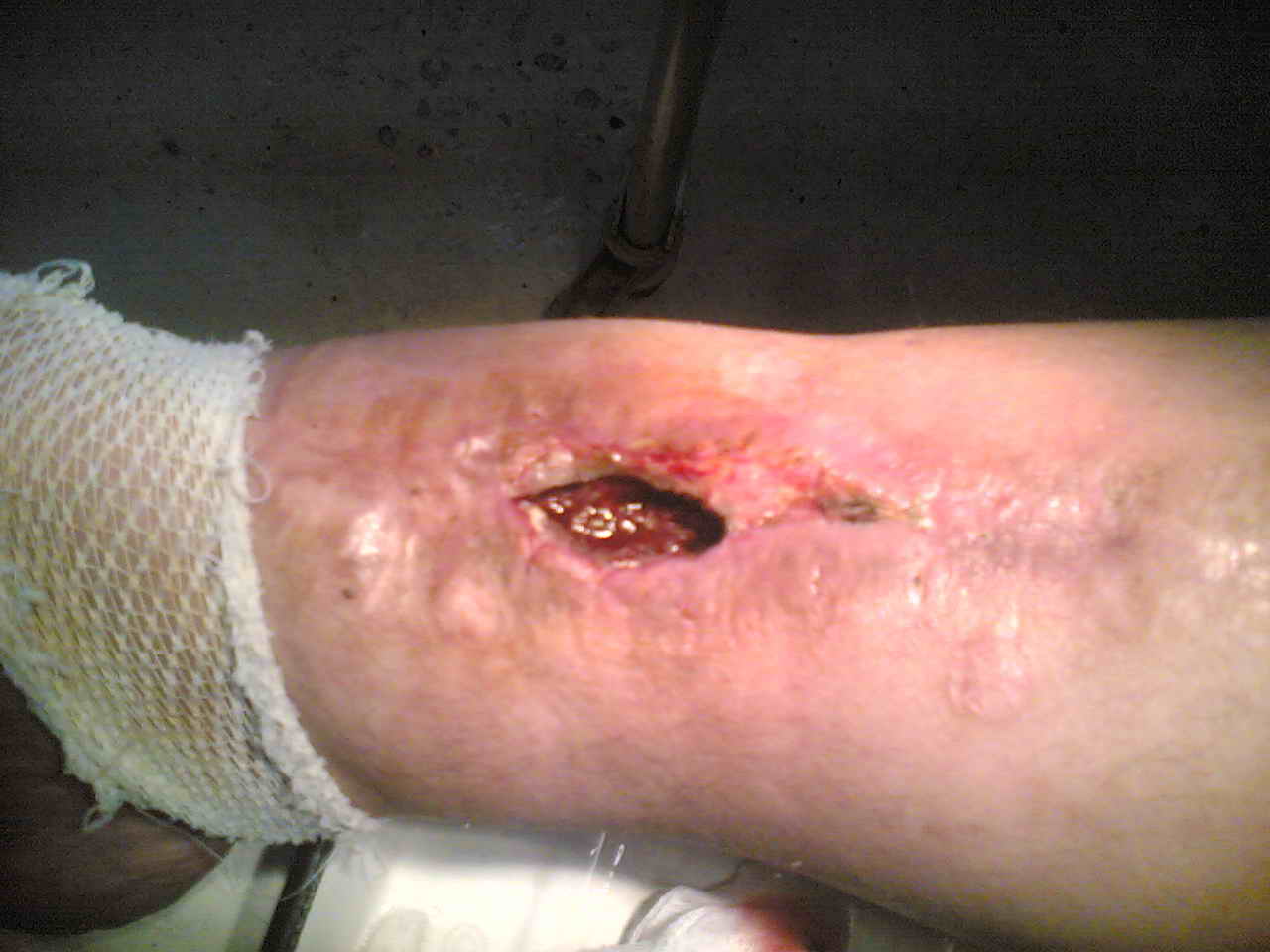Через 2 дня произведён МОС большеберцовой кости пластиной АО и винтами. Послеоперационный период осложнился остеомиелитом. Через 3.5 месяца пластина удалена. В марте 2005 года оперативное лечение в г. Екатеринбурге - санирование очага, некрэктомия. В июне 2006 года в ОКБ произведена секвестрэктомия, через неделю некрэктомия. Неоднократно получал антибактериальную терапию, в результате чего сформировалась сенсибилизация ко многим антибактериальным препаратам. В данный получает перевязки. Локально сохраняется кратерообразная гнойная рана, размерами до 4 х 3 см. Хотелось бы узнать Ваши мнения по поводу дальнейшего ведения данного пациента.